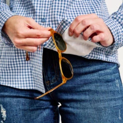 - Sunglasses cleaning cloth hidden in the hem keeps shades or phone screen spot free